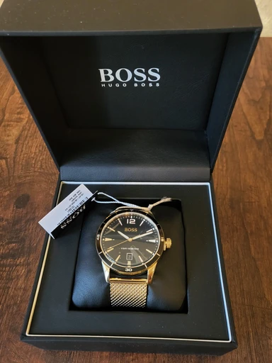 Elegant Hugo Boss men's watch with a black and gold two-tone design. The watch features a durable stainless steel strap and precise quartz movements. Perfect for everyday wear or special occasions. Water-resistant up to 50 meters.