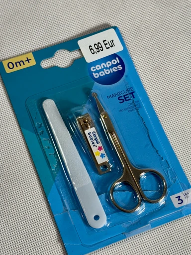 The Canpol Babies manicure set includes baby nail scissors, clippers, and a nail file. Suitable for use from 0+ months. Ideal for caring for a baby's delicate nails, ensuring accuracy and safety.