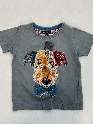 Autograph brand toddler T-shirt, suitable for ages 12-18 months. The grey T-shirt is adorned with a colorful dog's face applique. The material is soft and comfortable, ideal for everyday wear. The size is accurate and the clothing item is in good condition. Perfect choice for a stylish toddler.