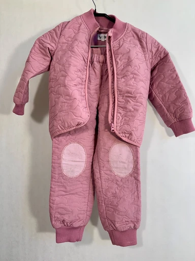 Molo children's set, size 110/116. Comes in pink, consisting of a jacket and pants. Soft and comfortable to wear with light padding. The pants have visible wear marks on the knees. Ideal for the spring or autumn season.