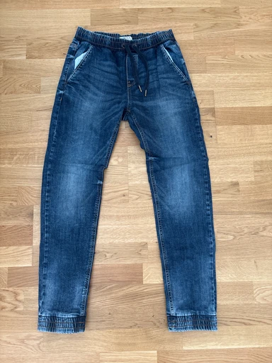 Lindex men's jeans in size EUR 164 (UK 13-14). Regular fit, blue, elastic waistband with drawstring closure, and cuffed leg ends. Made in Bangladesh. In very good condition, suitable for everyday wear.