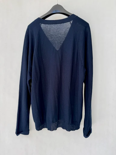 A dark blue long-sleeved sweater in good condition. It features a V-neck front, measuring 61 cm in length and 33 cm in width. Perfect for everyday wear or layering.