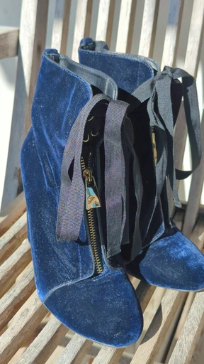 Stylish velvet blue ankle boots featuring ribbon laces and side zippers for easy wear. The boots show minimal wear on the soles and are in very good used condition, with no visible signs of damage to the fabric. Perfect for adding a touch of elegance to any outfit. Size 37 eu