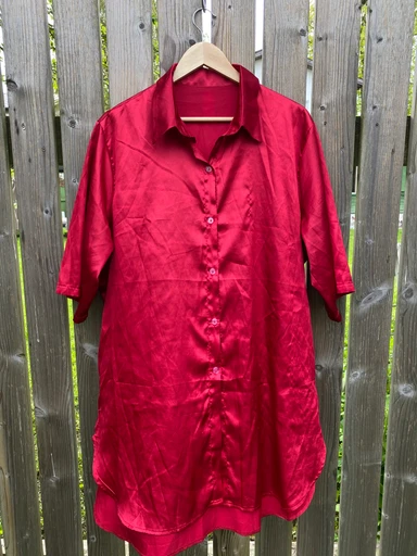 A brightly shining silky nightgown, size XL. Made of 100% polyester. Shows slight wear but is generally in good condition. Needs ironing. If unsure about size, feel free to come and try it on.