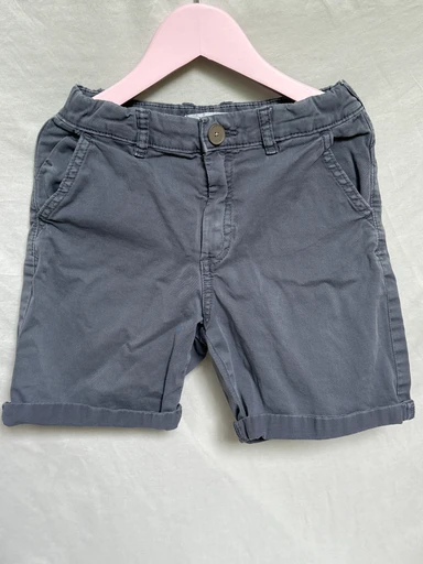 Gray boys' shorts, size 122. The shorts are used but in good condition with minor signs of wear. Buttons and zipper work well, made of cotton material. Suitable for everyday wear.