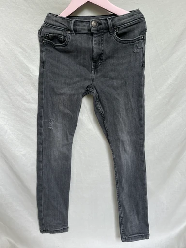 Gray jeans, ZARA Premium Super Elastic, size 128. The material is stretchy and comfortable. Used but in good condition; normal signs of wear and slight wear on the knees. Suitable for everyday wear.