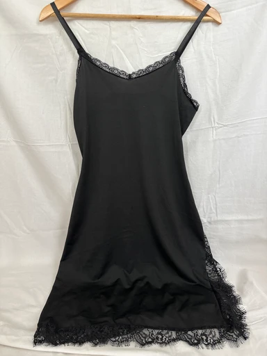 Black lace nightgown, size S. Material: 85% polyester, 15% acrylic. In good condition. Adjustable shoulder straps and lace embellishments.