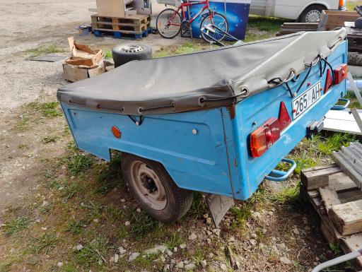 Metallist sinine järelhaagis konkskinnitusega. Varustatud tuledega ja tugeva kattega. Mõõdud: pikkus 2 meetrit, laius 1 meeter, kõrgus 0,5 meetrit. Sobib hästi erinevate kaupade transportimiseks.