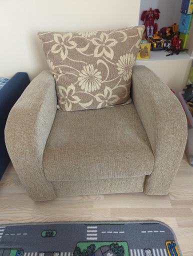 Mugav bež tugitool, millel on lillemustriga padi. Polsterdatud kangasegu materjaliga, mugava istumisosa ja tugeva puidust raamiga. Sobib suurepäraselt elutuppa või lugemisnurka, mõõtmetega umbes 90cm x 90cm x 80cm. Väga heas seisukorras.