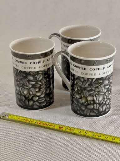 Komplekt kolmest keraamilisest kohvikruusist. Kruusid on kaunistatud kohviubade mustriga ning sobivad suurepäraselt igapäevaseks kasutamiseks. Heas seisukorras, mugavate käepidemetega.