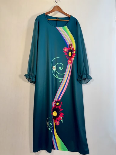 Shein Curve kleit suurusele 4XL. Kleit on valmistatud Hiinas ning sobib mugavalt ja stiilselt igaks sündmuseks. Värvuselt sinakasroheline, lille- ja triipudega kaunistatud esiosa, mis lisab värvilist aktsenti. Pikad varrukad annavad lisamugavust. Materjal on kergelt vooderdatud. Esemel võib esineda kerget sigareti lõhna.