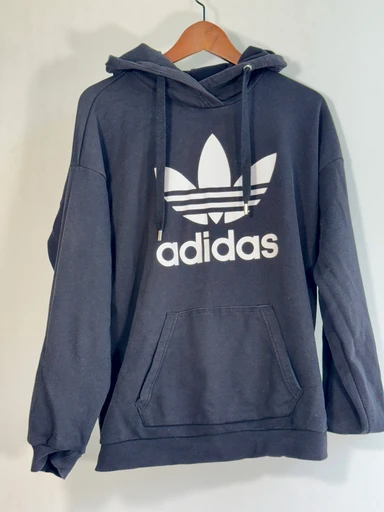 Adidas must kapuutsiga pusa, suurus UK 10/S, valmistatud Kambodžas. Materjal tundub pehme ja mugav, ideaalne igapäevaseks kandmiseks. Kehal nähtav brändi logo. Heas seisukorras, kerge kulumisega.
