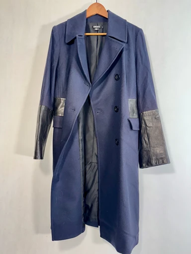 DKNY tumesinine mantel suuruses L. Mantel on valmistatud kvaliteetsetest materjalidest ja sellel on mustad nahast detailid varrukatel ja vöökohal. Seisukord hea, nähtavaid defekte pole. Sobib jahedamateks ilmadeks ning lisab elegantsi igapäevasele riietusele.