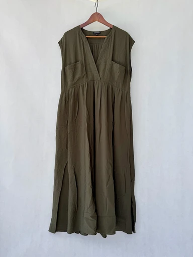 Oliivroheline kleit brändilt Whistles, suurus EU 42. Valmistatud 85% viskoosist ja 15% linasest; vooder 100% puuvill. Kleit on hea seisukorras, maksipikkusega ja sobib mitmesugusteks puhkudeks. A-lõige ja V-kaelus lisavad elegantsi.