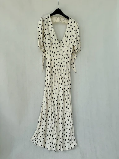 Näidatud on kasutatud MNG naiste kleit suuruses M. Kleit on valge mustade täppidega, millel on avatud seljaosa ja lühikesed varrukad. Kangas on heas seisukorras, kuid mõned kasutusjäljed võivad esineda. Sobib nii igapäevaseks kandmiseks kui ka pidulikeks sündmusteks.