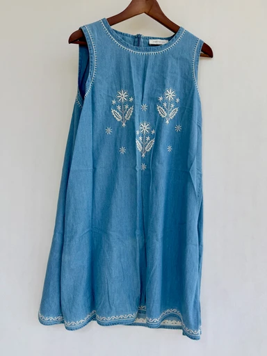 Cortefiel sinine kleit, suurused pildil. Tikandiga kaunistatud ning näitab kergeid kasutusjälgi, kuid heas seisukorras. Tagant lukuga suletav. Sobib igapäevaseks kandmiseks. Materjal maailmavaatlus.