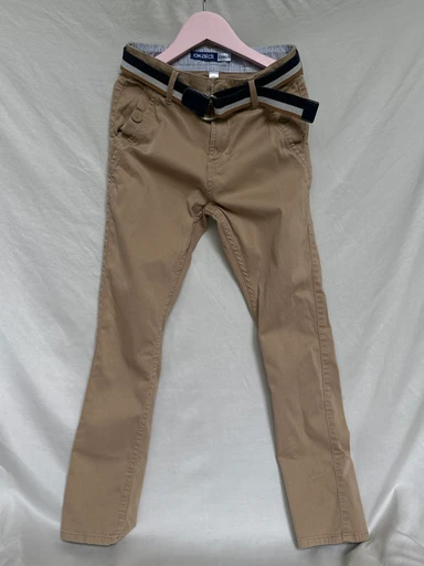 Okaïdi pruunid chino slim püksid, suurus 9A/134cm. Kaasas sini-valge-pruun vöö. Materjal puuvillane, mugav ja vastupidav. Püksid on kasutatud, kuid heas seisukorras. Võivad esineda vähesed kulumisjäljed, kuid ei ole märkimisväärseid kahjustusi. Sobib igapäevaseks kasutamiseks.